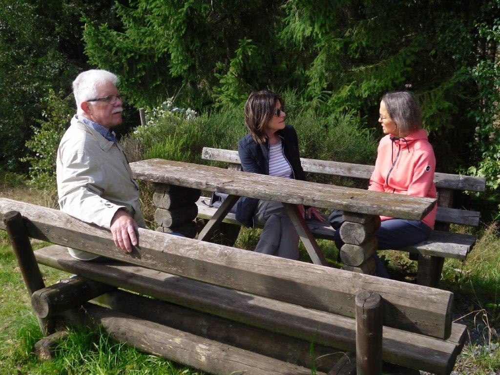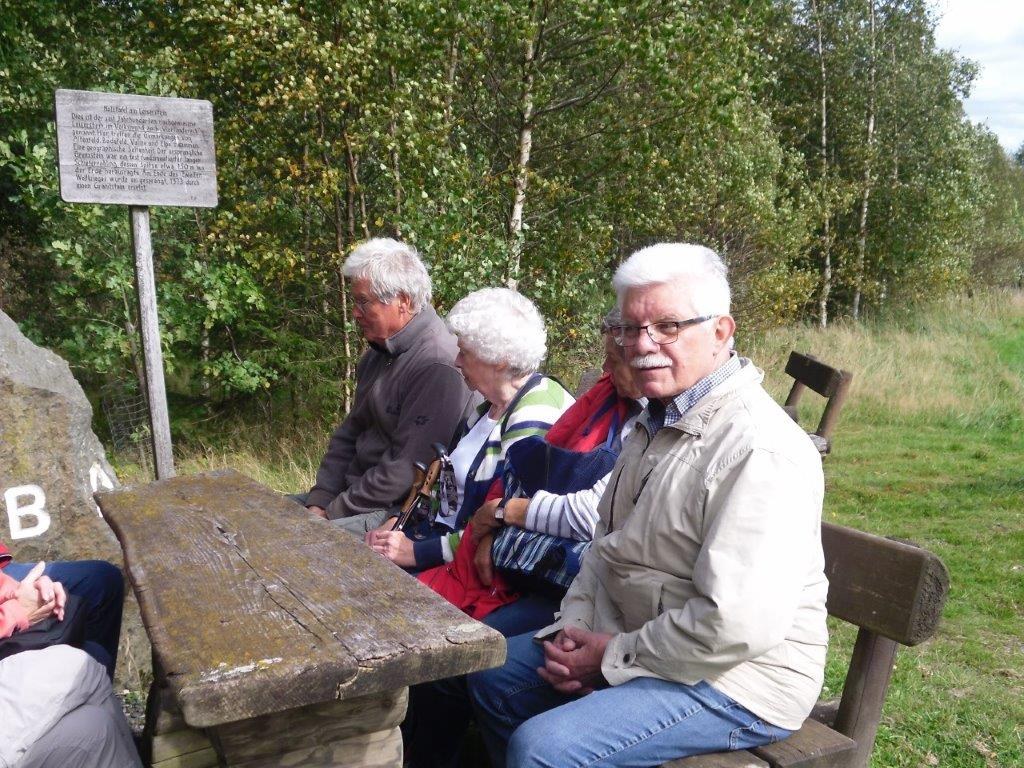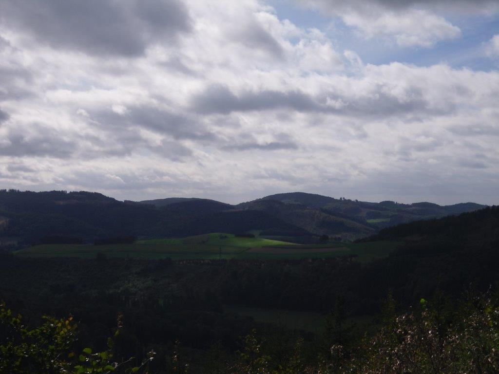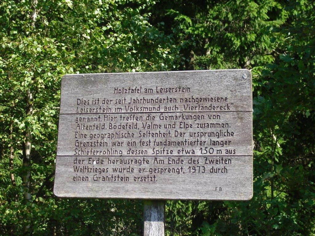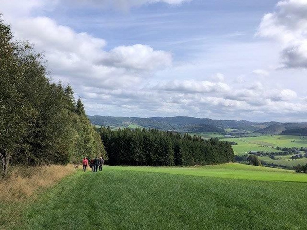 Wir haben uns mit 9 Personen in Meschede getroffen und sind in Fahrgemeinschaft nach Heinrichsdorf zum Dorfgemeinschaftshaus gefahren. Von dort aus sind wir über den Wanderweg E3 zum Leiser Stein gewandert. Auf dem Weg dorthin sah man die Bruchhauser Steine, den Ort Elpe und Siedlinghausen. Am Leiser Stein, auch vier Ländereck genannt, ist die Grenze von der Gemeinde Bestwig , Stadt Olsberg , Stadt Schmallenberg und Stadt Winterberg . Nach einer kurzen Pause sind wir zum Forsthaus Schwabenberg gewandert. Am Forsthaus angekommen erzählte Annette das sie dort aufgewachsen ist und holte ein Getränk aus ihrem Rucksack. Nach der Stärkung sind wir wieder zu unseren Autos gewandert. Der Kaffee und Kuchen hat uns nach der schönen Wanderung gut geschmeckt.