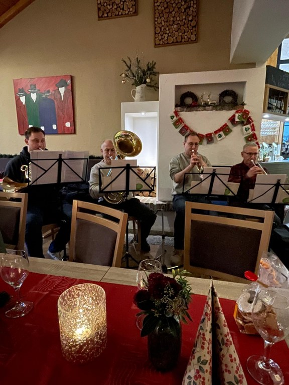 Das Seniorenbeiratsmitglied Josef Brüggemann hatte sich noch etwas Besonderes für den Ausklang der Feier einfallen lassen. Er hatte vier Bläser von der Musikkapelle „Die Caller“ engagiert. Die vier Herren „trompeteten“ mit Elan und Ausdauer diverse bekannte und nicht mehr ganz so bekannte Weihnachtslieder. So zog sich das gemütliche Treffen noch etwas hin.