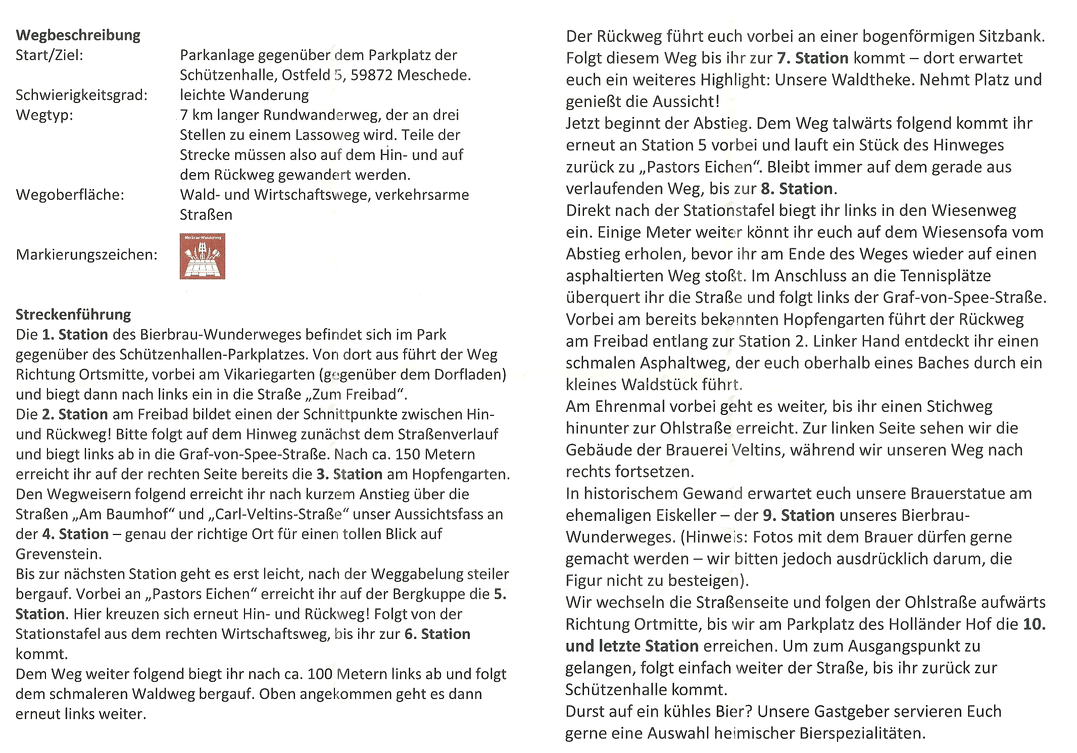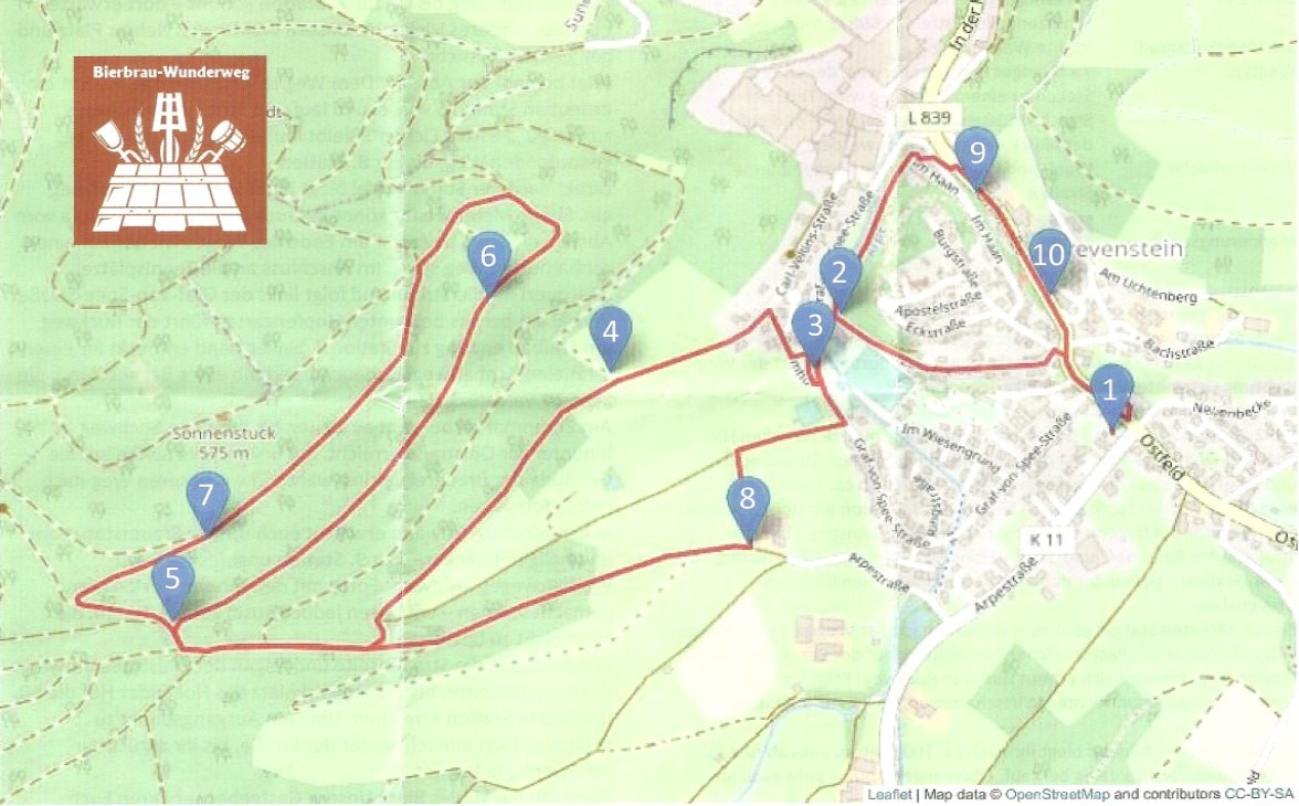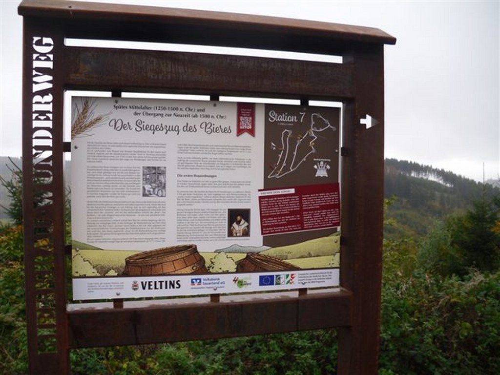 Wir haben uns mit 6 Personen in Meschede getroffen und sind mit Fahrgemeinschaften nach Grevenstein zur Schützenhalle gefahren. Gegenüber der Schützenhalle startet der Wanderweg Bierbrau-Wunderweg Grevenstein. Wir sind den Rundweg, mit den 10 Stationen, ganz gewandert. An den Stationen werden das Bierbrauen und die Geschichte über das Bier dargestellt. Auf dem Wanderweg hat man schöne Aussichten. Am Ende der Wanderung haben wir im Cafe Franzes uns den Kuchen schmecken lassen.